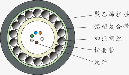 GYXTA——中心管松套填充式、钢丝铠装、铝-聚乙烯粘结护套的通信用室外光缆。
